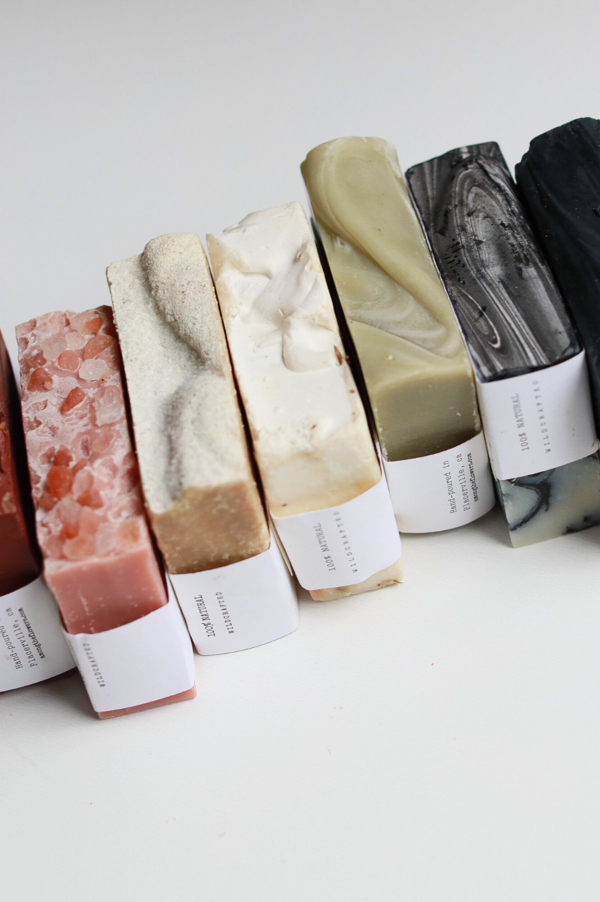 Ingredients: water, olive oil, coconut oil, palm oil, sodium hydroxide, castor oil, shea butter, and essential oils and clays.