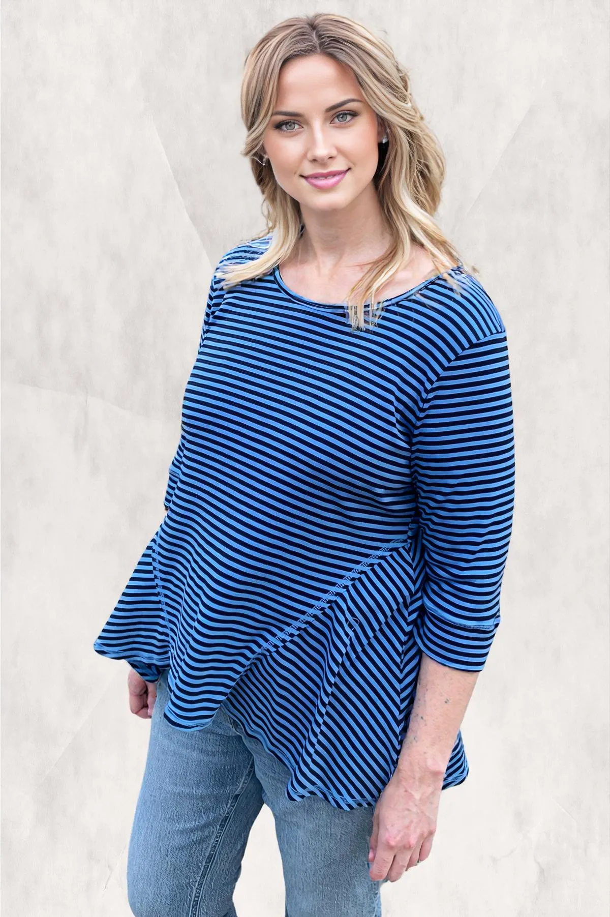 This CMC Click tunic features a flattering navy stripe design, a comfy scoop neckline, and 3/4 length sleeves. It also has unique front panel details, a trendy high low hem, and a longer length for added coverage. Stay stylish and comfortable in this versatile piece