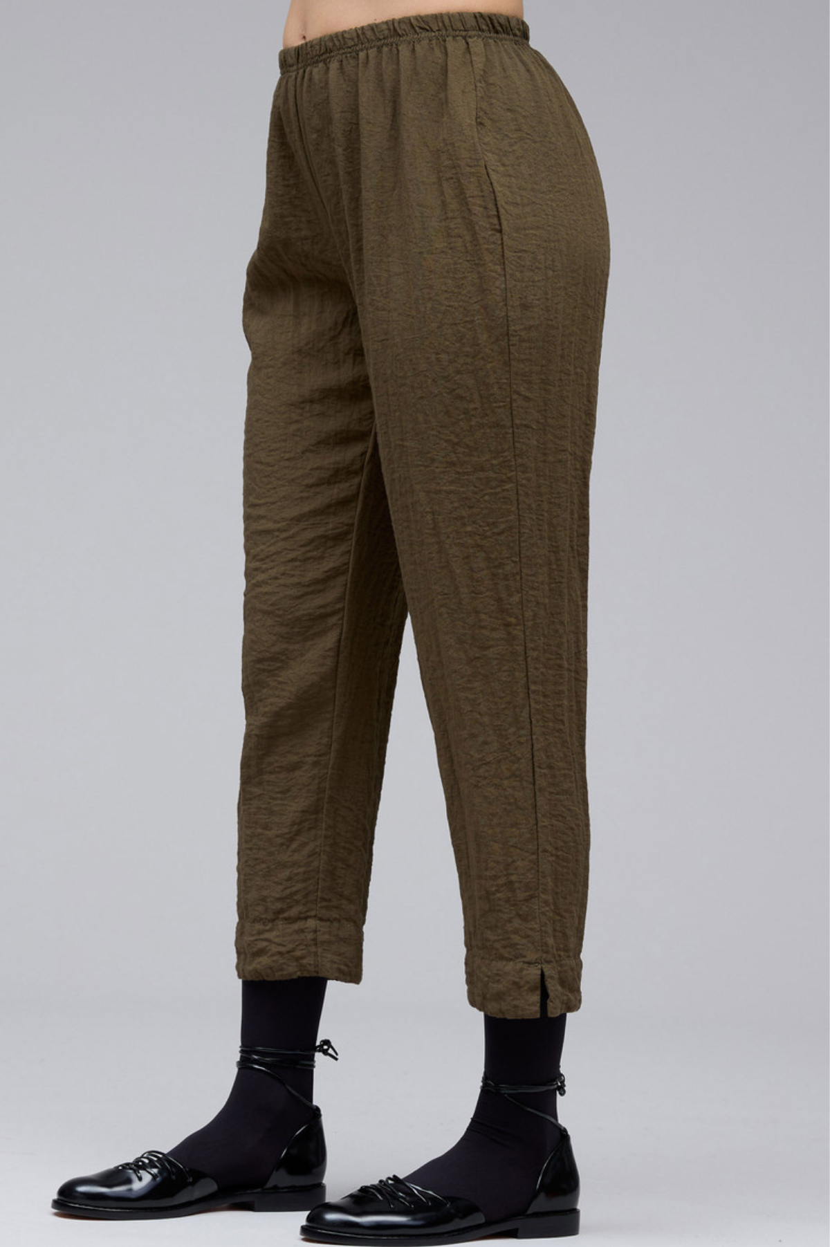 The Cut Loose Parachute Cropped Pant with Darts for Fall 2025 is available by special order. It features a comfortable elastic waistband, a wide leg that narrows at the hem with darts, and a flattering cropped length.