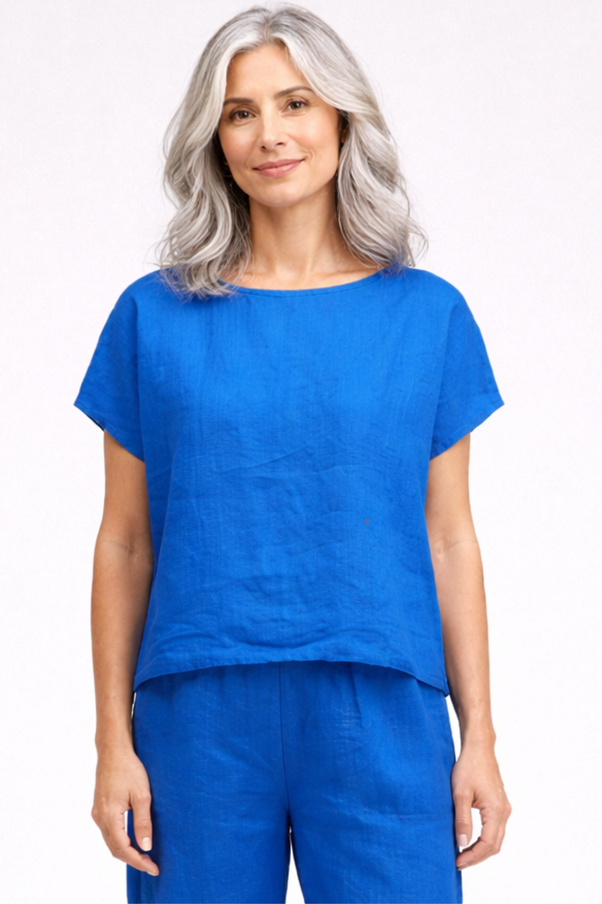 Cut Loose Hanky Linen S/L Hi-Low Top Summer 2026- Special Order Shown in Vivid Blue. A versatile wardrobe essential crafted from 100% hanky linen. This lightweight, breathable top features a rounded neckline, short sleeves, and a flattering hi-low hem that moves beautifully. Made in the USA with attention to quality and comfort.