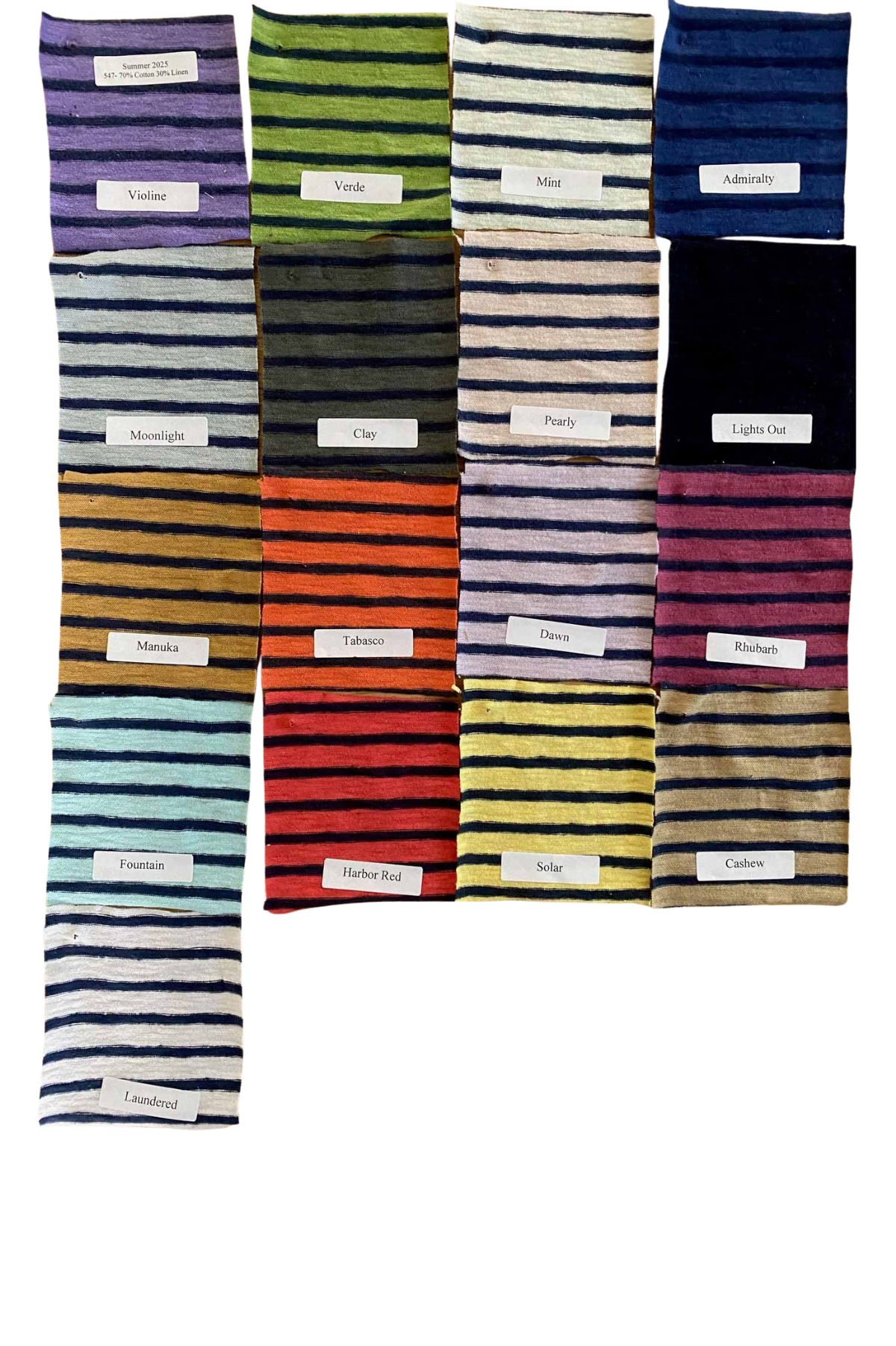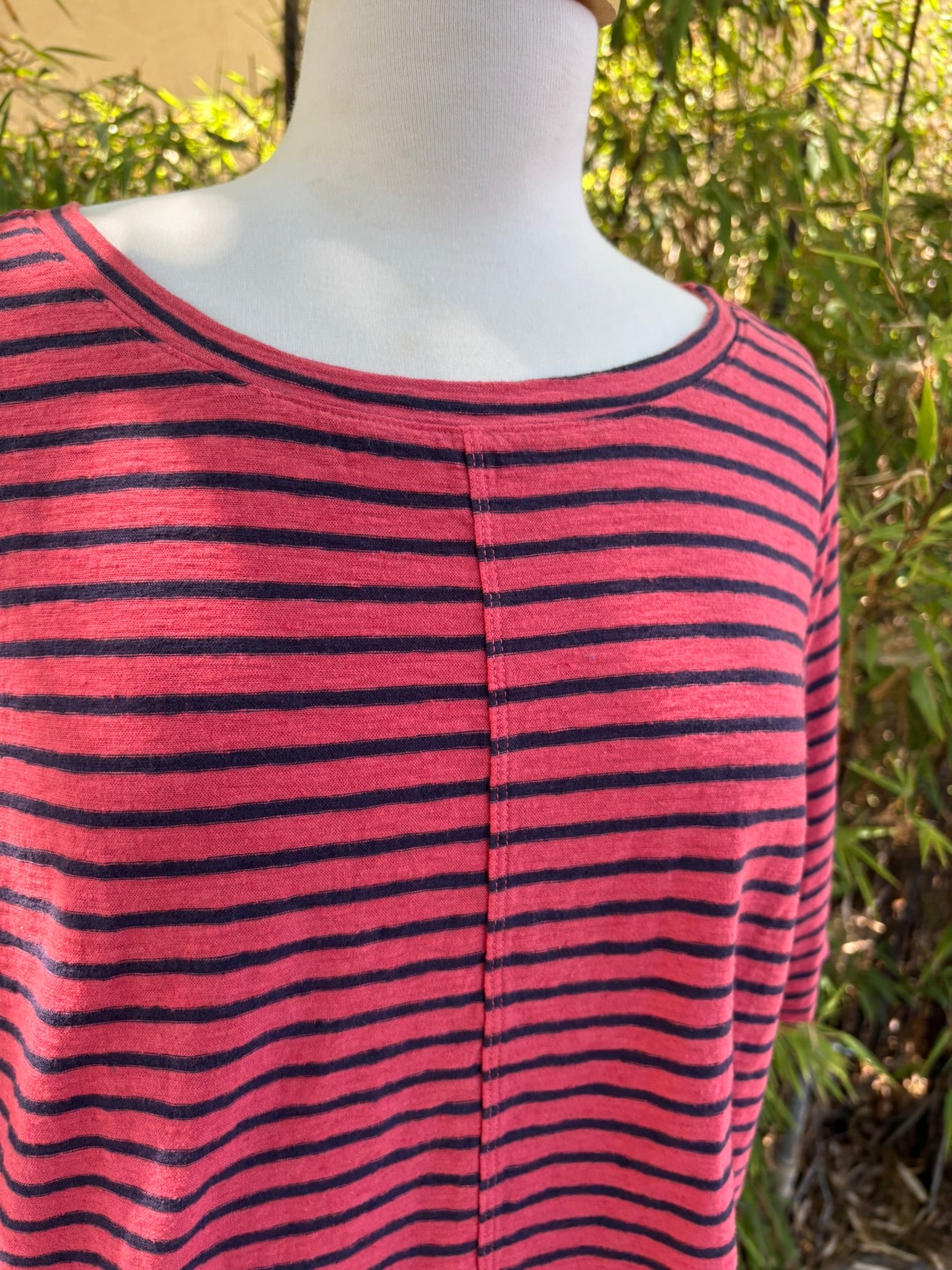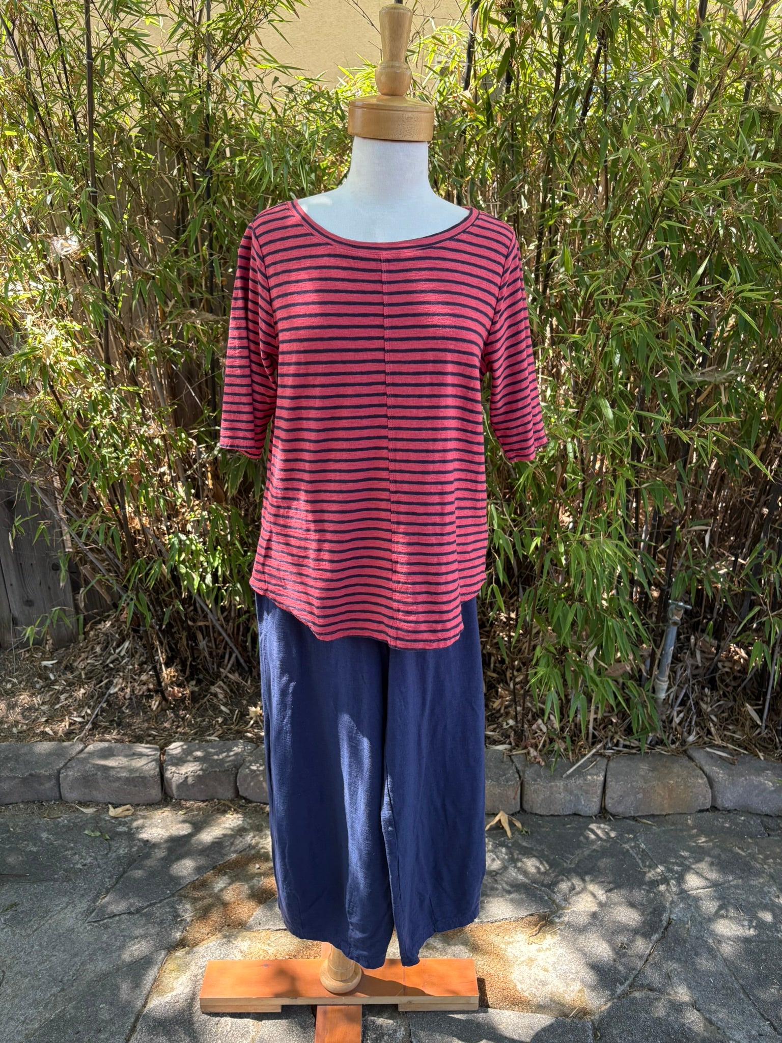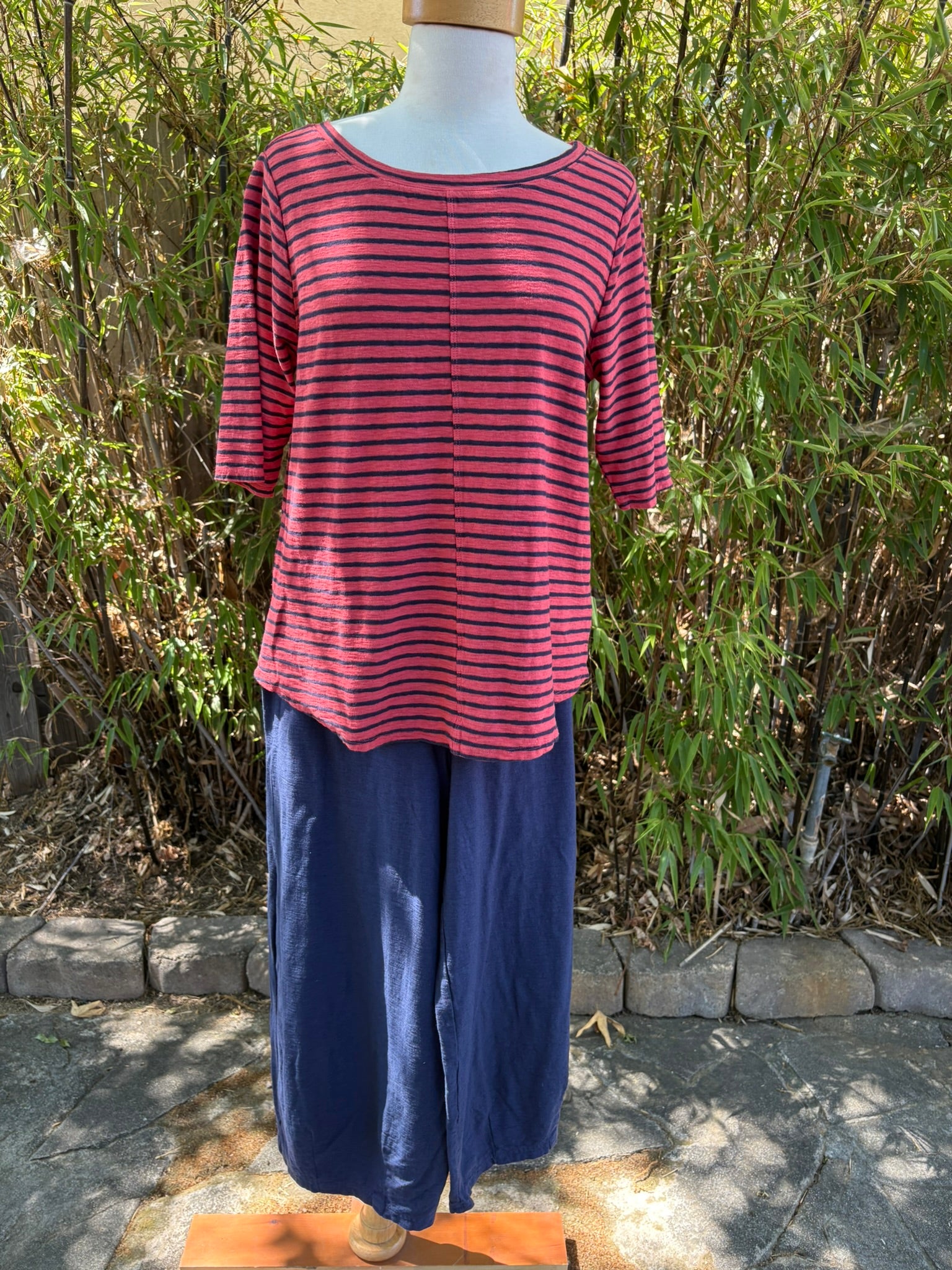 This Cut Loose Navy Stripe Elbow Top for Summer 2025 features a round neckline, elbow-length sleeves, and a center seam to enhance its stylish appeal.