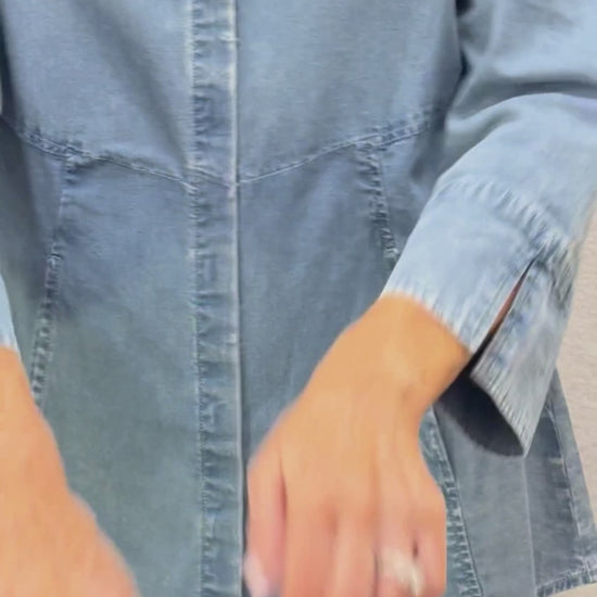 A versatile habitat light denim shirt featuring a classic collar, subtle A-line silhouette, and practical pockets. Long sleeves with cuffs and slits offer easy styling, while the extended length works for layering or wearing solo. The Habitat denim shirt is a fan favorite!